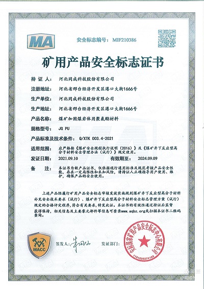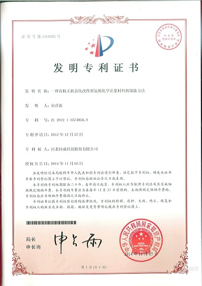 2014年,公司改性聚氨酯注浆材料获得国家发明专利。