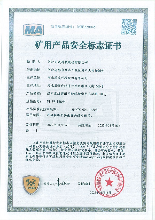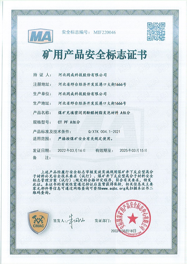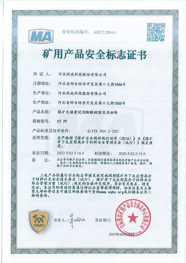 2022年3月16日,公司又一产品成功获得矿用产品安全标志证书——煤矿充填密闭用酚醛树脂发泡材料,安全标志编号为:MIF210386。这是继“煤矿加固煤岩体用硅酸盐改性聚氨酯材料”、“煤矿堵水用聚氨酯材料”、“煤矿加固煤岩体用聚氨酯材料”取得安标之后,我公司取得的第四项矿用高分子材料安标。