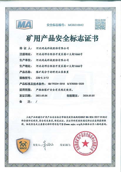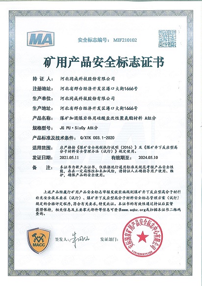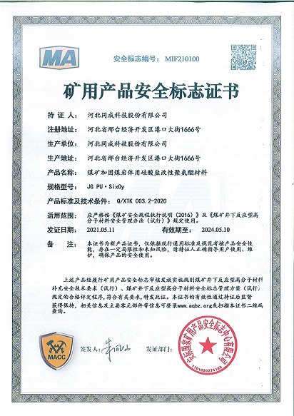 2021年5月11日,公司化学注浆材料产品煤矿加固煤岩体用硅酸盐改性聚氨酯材料顺利取得安标。