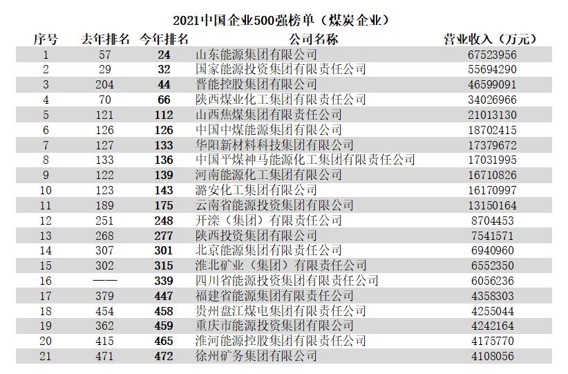 今年共有21家煤炭企业上榜。其中,山东能源集团有限公司、国家能源投资集团有限责任公司、晋能控股集团有限公司、陕西煤业化工集团有限责任公司入围榜单前100名。四川省能源投资集团有限责任公司为新增上榜企业,有8家企业排名较去年有所提升,11家企业排名下降,1家企业排名持平。