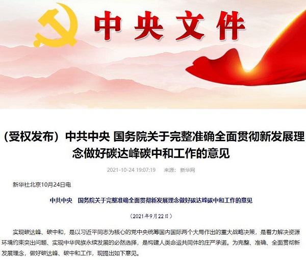 2021年10月24日,国务院印发《2030年前碳达峰行动方案》。《方案》提出,推进煤炭消费替代和转型升级,加快煤炭减量步伐,“十四五”时期严格合理控制煤炭消费增长,“十五五”时期逐步减少;严格控制新增煤电项目,新建机组煤耗标准达到国际先进水平,有序淘汰煤电落后产能;推动重点用煤行业减煤限煤;大力推动煤炭清洁利用,合理划定禁止散烧区域,多措并举、积极有序推进散煤替代,逐步减少直至禁止煤炭散烧;严格项目准入,合理安排建设时序,严控新增炼油和传统煤化工生产能力,稳妥有序发展现代煤化工;引导企业转变用能方式,鼓励以电力、天然气等替代煤炭;调整原料结构,控制新增原料用煤,拓展富氢原料进口来源,推动石化化工原料轻质化;产业结构偏重、能源结构偏煤的地区和资源型地区要把节能降碳摆在突出位置。